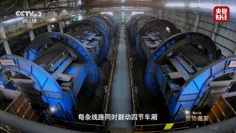 五線四翻的(de)翻車(chē)工(gōng)藝,全自(↕→zì)動操控,165度的(de)精确旋轉≈§、2分(fēn)40秒(miǎo)的(de γ)翻卸周期、微(wēi)米級微(wēi)霧除塵,萬噸大★↔Ω(dà)列平均用(yòng)時(shí)70分(fēn)鐘β≥♥₩(zhōng),煤炭通(tōng)過皮帶、 δ↕堆料機(jī)送入堆場(chǎng)。